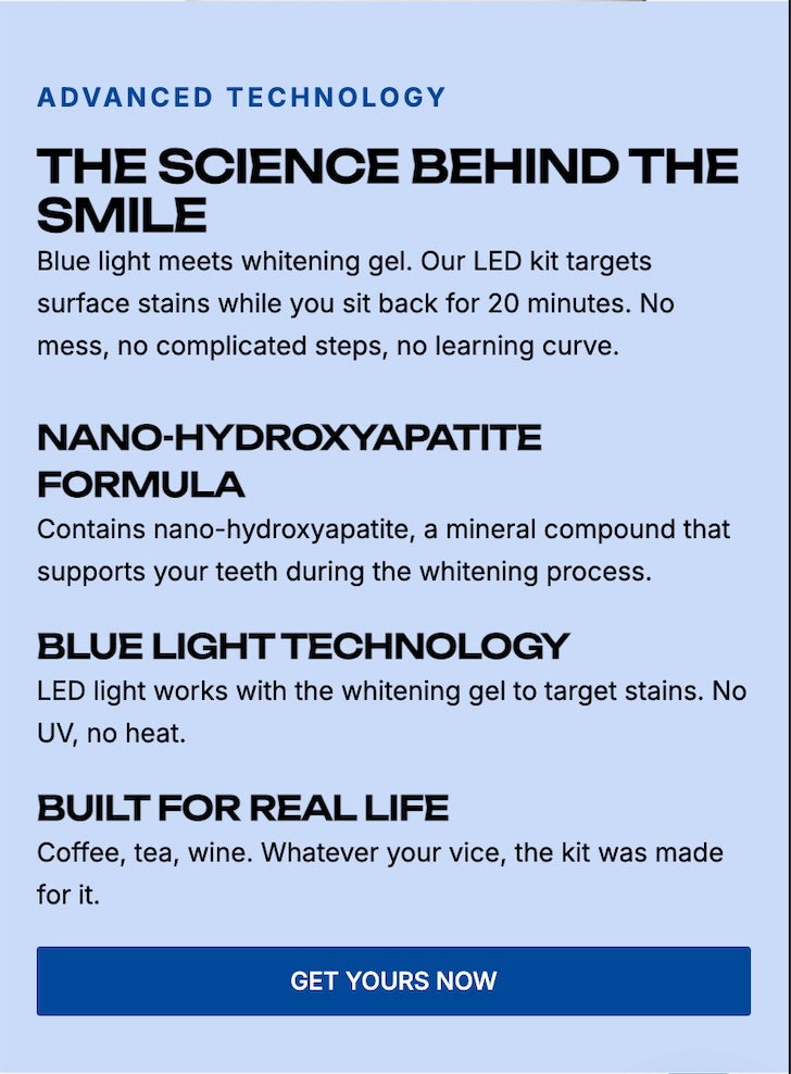 Our strips use PAP to target surface stains head-on. No peroxide, no trade-offs. Just a formula that gets to work in 30 minutes flat.